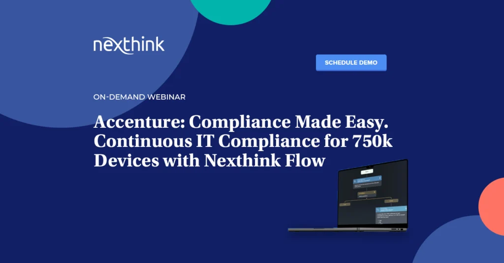 During this webinar, Jason Bentz, Design Experience Senior Manager – Global IT Metrics Lead, Accenture LLC, will showcase how Accenture uses Nexthink Flow, a powerful orchestration engine, to solve recurring compliance issues automatically improving the productivity of IT teams and employees.